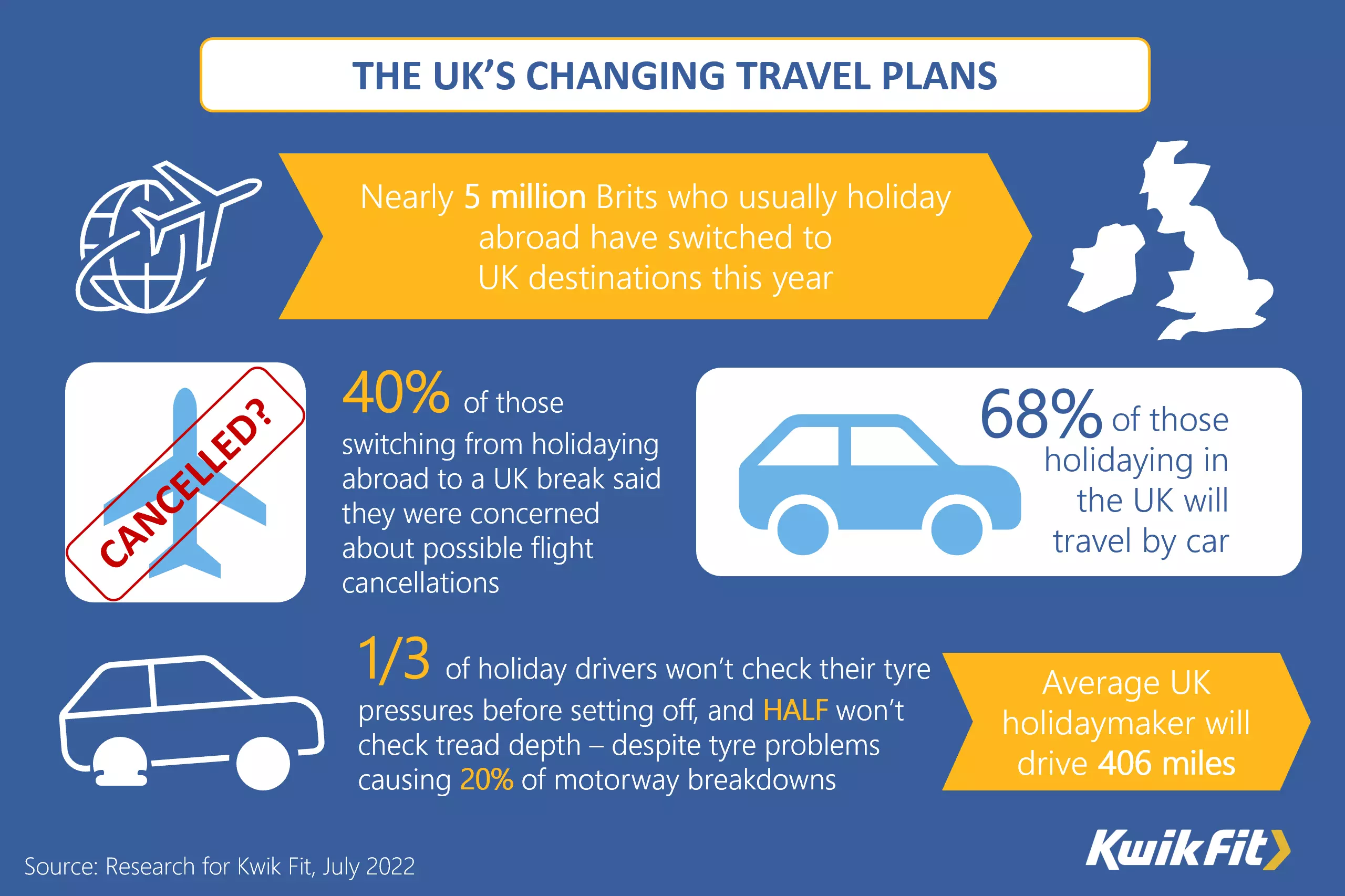 The research, carried out this week for Kwik Fit, the UK’s leading automotive servicing and repair company, reveals that of those who have decided to stay in the UK instead of going abroad, as usual, 40% were put off from flying abroad by the fear of airlines cancelling flights. 25% say they remain concerned about Covid-19 and feel that there is a lower risk of catching it in the UK than abroad.