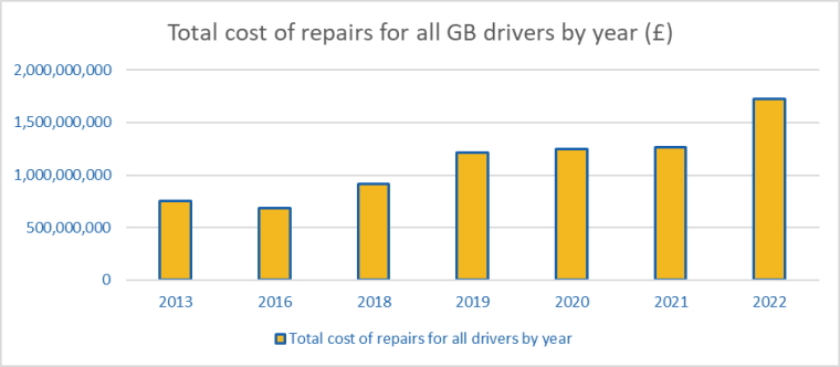 The number of British drivers experiencing pothole problems has risen, with 59% of drivers saying they have hit at least one a week over the last year, up from 46% in 2021. Some 13.3 million motorists say their car has suffered damage in the last year as a result of a pothole impact, with the average individual repair bill coming to £132.